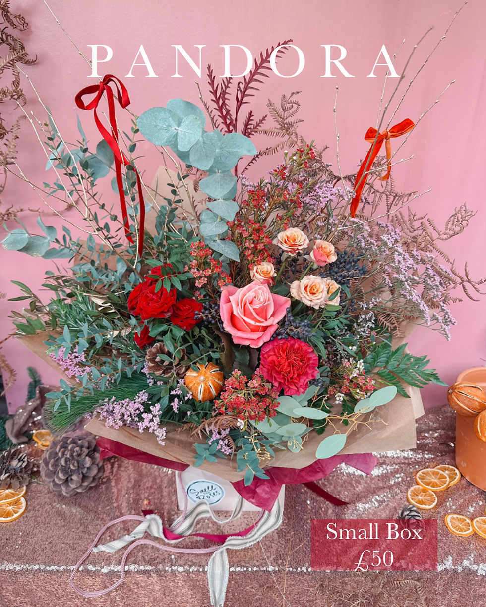 All box bouquets come in our limited edition Christmas packaging & cards. Each design will be freshly made so please allow 3 working days when ordering. Designs made from natural materials which can differ from week to week, sometimes alternative stems may need to be used in the combo.