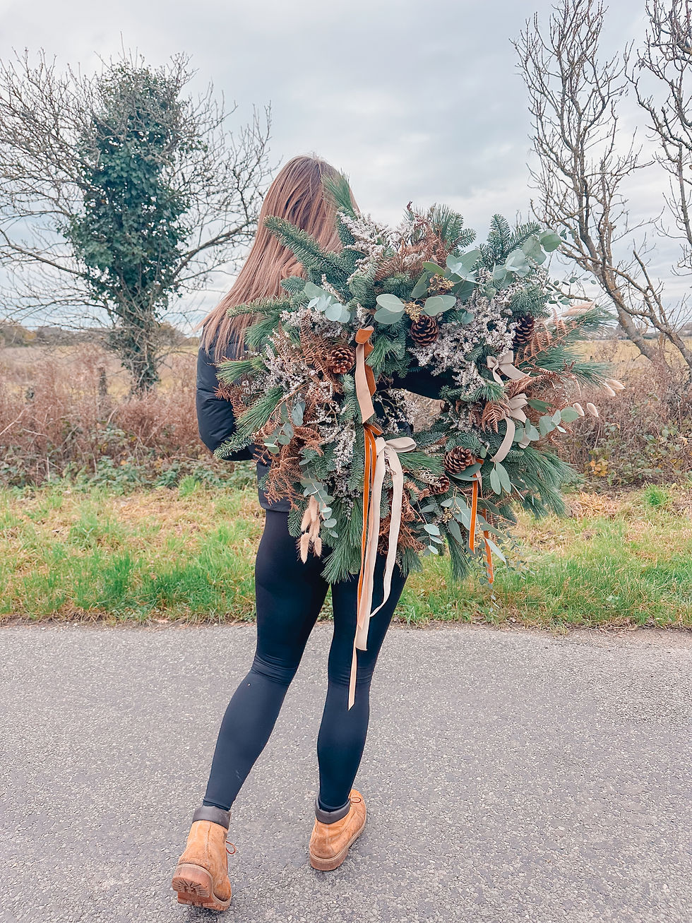 If your dreaming of a cosy white Christmas then this ones the design for you. A beautiful blend of pale green festive foliage, contrasted with rusty toned bracken, white fluffy filler flowers, caramel bunny tails, textured cones and velvet bows in an array of toasted vanilla shades. A cosy warm design with a soft effortless vibe.